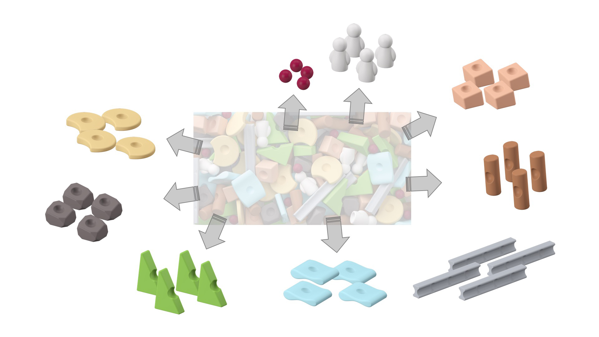 🇬🇧 Take turns to choose pieces from the mixed pile of Resources®. Group the components by form and color.